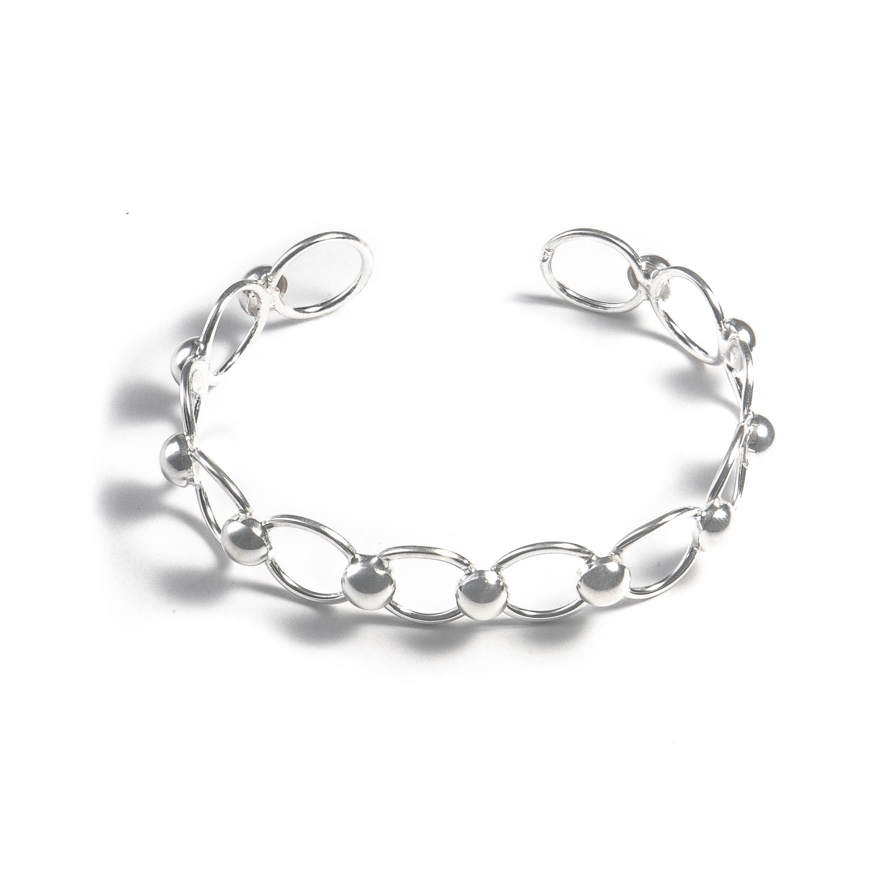 Ligera, elegante y con un encanto único. Esta pulsera abierta en plata combina delicados eslabones ovalados con pequeñas esferas pulidas, creando un diseño armonioso y sofisticado. Su estructura abierta permite que la luz se refleje entre cada elemento, aportando un brillo sutil y envolvente.